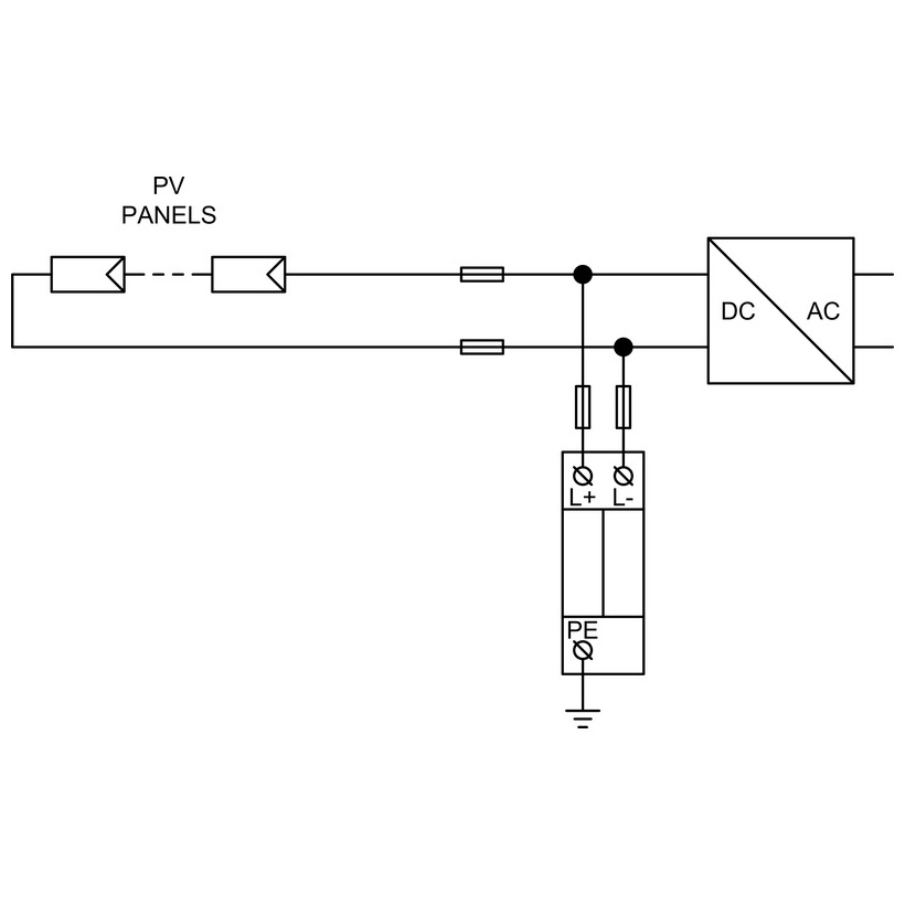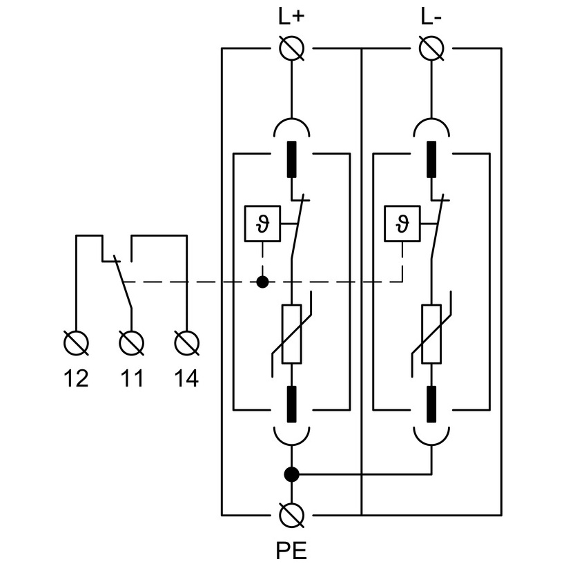 L+、L-、およびPEの間の特定のバリスタセクターには、それぞれ内部熱切断器が装備されています。バリストが終末期(過熱)に到達すると、切断されたトリップが目に見えて障害を示し、DC電流を中断します。彼らの特別な建設のおかげで、これらの逮捕者は別のバックアップヒューズ(システム調整の対象)なしで設置できます。